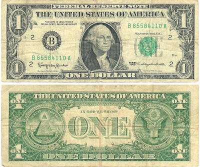 Esaminando il dollaro, l’attenzione si focalizza subito sull’effige del primo Presidente degli Stati Uniti d’America, George Washington. Eletto alla presidenza nel 1789, supervisore dei lavori di costruzione della Casa Bianca (sede ufficiale del Presidente in carica), Washington, in occasione della cerimonia ufficiale di insediamento, fece il suo solenne giuramento sulla sacra Bibbia di proprietà della loggia massonica St. John N°1 di New York.
